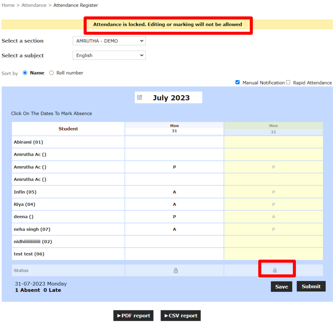 - After marking absent you can save and submit it. The attendance will be locked. Lock symbol & a flash message is displayed